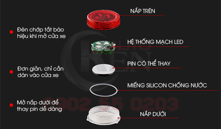 Sử dụng pin và hệ thống cảm biến cực nhạy giúp đèn ngay lập tức phát sáng khi cửa xe ô tô của bạn bật mở. Ánh sáng màu đỏ mạnh chớp nháy liên tục dễ dàng giúp cho các xe chạy đằng sau hay kề bên nhận ra ngay-lập-tức, giúp giảm thiểu đáng kể các trường hợp nguy hiểm xảy ra, đặc biệt là trong đêm tối.